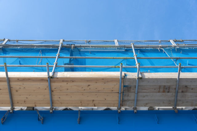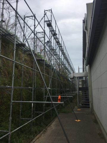 また中にはオプション部材で、各種の垂直壁や斜壁に取付可能な専用金具も用意されているものもあるため、現場の状況を的確に判断し、足場工事を行います。