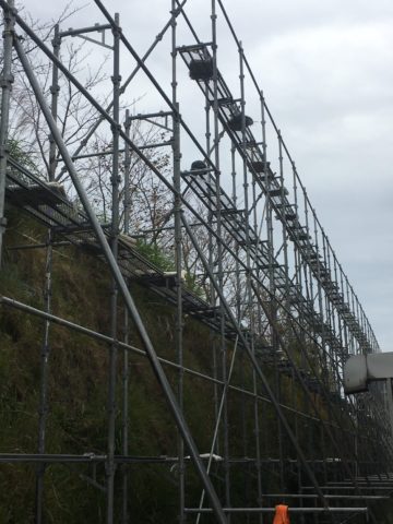土木工事では、足場を組む接地面が垂直傾斜面である場合も多いですが、株式会社エイト工業では安全性や使い勝手を考慮した足場をご提供しております。柔軟な対応を心がけておりますので、お気軽にご相談ください。